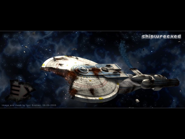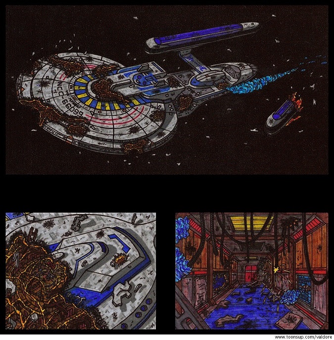 The pocket universe is a smuggler's hold, and inside is a treasure trove someone had obviously forgotten about, or been prevented from returning to it all these years. The facility is powered by a Romulan Artificial Quantum Singularity Core and is expected to last for millennia. Inside this micro universe we have the parts and loot from a lifetime of gathering laid all about, but the crew isn't looking at any of them. They see the “USS Lafitte” an Excelsior class Starship retired after the Dominion war and a crippling hull shot.