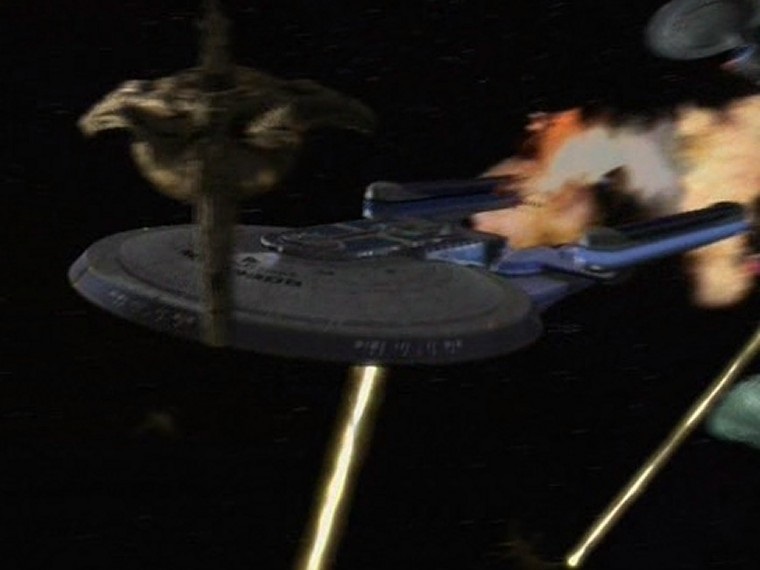The Aerowing finds the device containing the pocket universe and is trying to pry it open. Judah makes the connection and the ship hums in response, all systems firing. The pocket universe collapses to the chagrin of the the Aerowing who is now faced with a massive Excelsior class Starship. They have no weapons, tractor beam or even a fully functional deflector but the pure bluff from Quint makes Tasco stand down. They recover the aerowing and take Tasco into custody. They fly out of the scrapyard and begin warp tests when they detect a Galaxy Class Starship headed their way, hailing them. There is no running, but Quint makes an impassioned speech that they are not pirate or scavengers, that this was their ship, and they had much work to do.